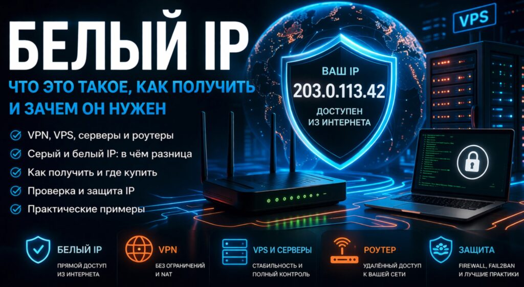 Где взять: проще всего — подключить услугу у провайдера (50–500 руб/мес) или арендовать VPS (от 150 руб/мес). VPS выгоднее если нужен не просто IP, а полноценный сервер.