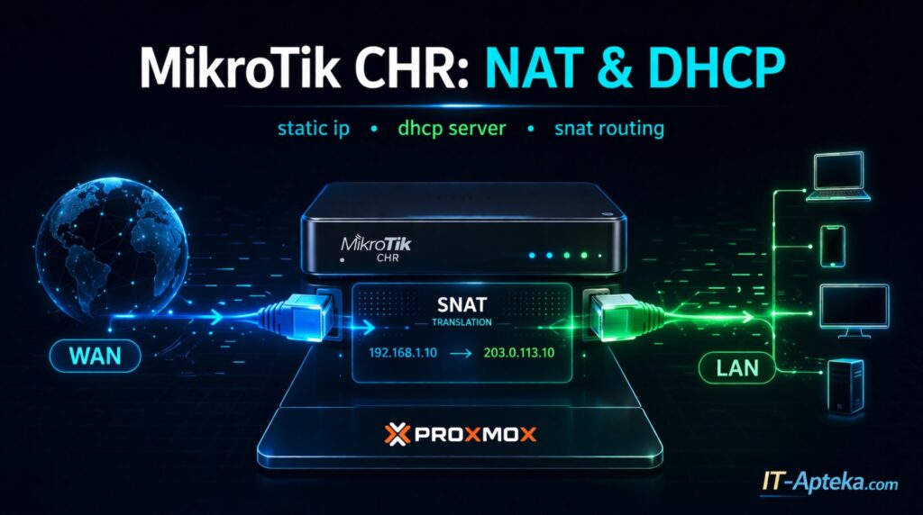 Настроишь полноценную сеть на MikroTik CHR: статический IP вместо DHCP, дефолтный маршрут, DNS, DHCP сервер для LAN клиентов и SNAT для выхода в интернет. Клиенты за CHR будут получать адреса автоматически и ходить в интернет через роутер. Всё проверено на реальном стенде CHR 7.22.1 + Proxmox 9.1.4.
