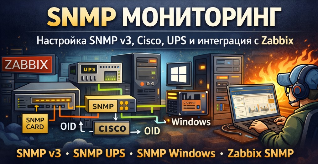 В этой статье разберём SNMP с нуля до продакшна: что это за протокол, как он работает, чем отличаются версии, что такое SNMP-карта для UPS, как настроить SNMP на Cisco и Windows, как подключить всё это к Zabbix — и пять реальных кейсов из жизни системного администратора. Готовые команды, минимум воды.
