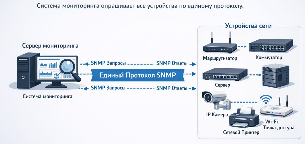 SNMP позволяет системе мониторинга централизованно собирать данные с сотен устройств, не устанавливая на каждое из них отдельный агент с проприетарным протоколом. Производители сетевого оборудования договорились поддерживать единый стандарт — и это решение оказалось на удивление живучим.
